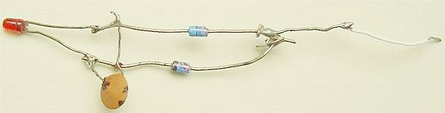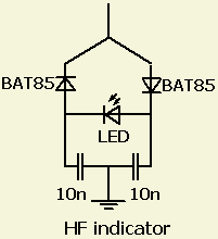 Misschien niet een origineel ontwerp maar het werd al experimenterend (fig») in elkaar gezet. Bij het proefmodel werd de condensator tussen duim en wijsvinger gehouden en met het draadeinde in de buurt van een open lijn, anodekring of op het metalen object kon HF spanning aangetoond worden. Met enige oefening is zelfs aan de intensiteit van het licht uit de rode LED te zien of er meer of minder spanning is dan op een ander meetpunt.
