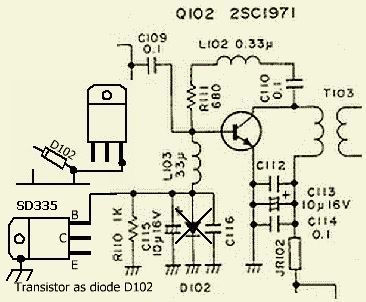 Door koelen van het gebied rond D102 blijft de output stabieler. Daarom is D102 vervangen door een transistor met een TO-220 behuizing zodat de collector direct op het chassis gemonteerd kan worden. De basis-collector overgang wordt als diode gebruikt en omdat de collector aan massa zit, blijft de "diode" stabieler.