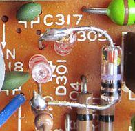 Gelukkig kon dat anders opgelost worden, door een aansluitdraad van de afgeknipte D301 als soldeerpunt voor de nieuwe didode te gebruiken met als andere soldeerpunt een draad van diode D305.