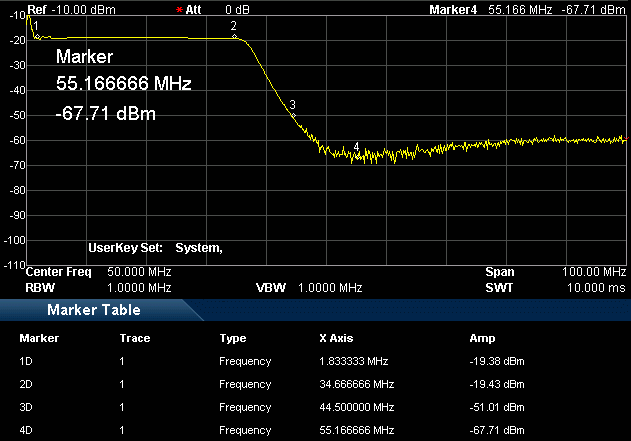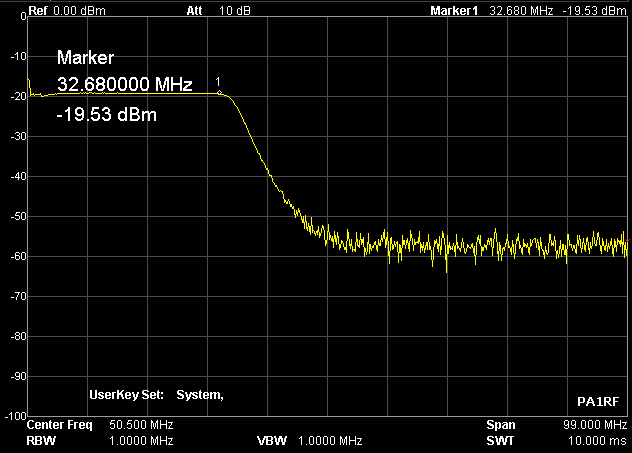 The measurement results were so good that no further effort was made to screen all poles of the filter. If you want to do so, you can advantageously place («fig) standard feed-through capacitors of 150 pF and 180 pF in the dividing screens. With 200 W and such types, I have not encountered any problems. On my spectrum analyzer the graph looks like the pictures below. The center frequency is 50 MHz.