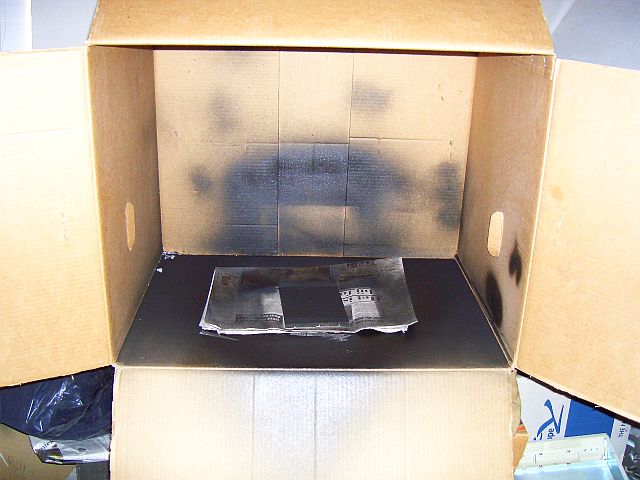 Een kartonnen doos van een breedbeeld TV als spuitcabine. |