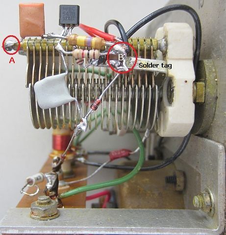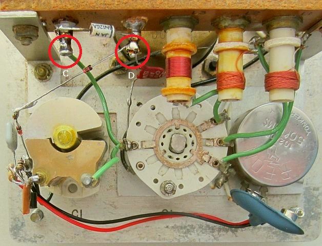 De inbouw is zelfdragend uitgevoerd, dat wil zeggen de twee aansluitingen (punten 'A' en 'B') van de variabele condensator C1 werden als montagepunten gebruikt. Het ziet er misschien rommelig uit, maar alle verbindingen zijn kort met maar één aard/massapunt. Het een en ander bevordert de HF eigenschappen. De originele diode 1N126A wordt los gesoldeerd van punt 'C' en van de niieuwe diodeschakeling gaat een draad naar punt 'D'.