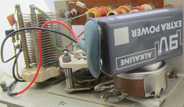 Ook de 9 V batterij is binnen in de meter met deze plakband op de potentiometer vastgezet.