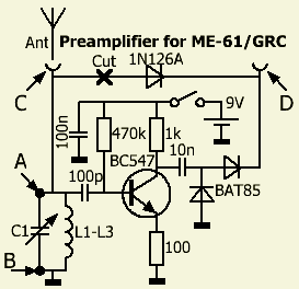 De voorversterker is niets bijzonders en is gemaakt met componenten uit de junkbox. Het stroomverbruik uit een 9 V batterij is ongeveer 5 mA. Om de versterking te beperken en zelfoscillatie te voorkomen is een 100 Ohm tegenkoppeling in de emitter aangebracht. De theoretische versterking is 10, maar het is de vraag of dat wel gehaald wordt door de dynamische belasting van de detector en spannings-verdubbeling met twee BAT85 diodes. Toch voldoet de versterking prima. In plaats van één BAT85 zou de originele 1N126A ook gebruikt kunnen worden, maar als men toch bezig is met de modificatie kan men net zo goed twee gelijke diodes monteren.