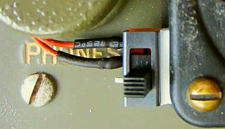De bovenstaande argumenten pleiten ervoor om voor een aan/uit schakelaar geen gaten in het front te boren. Omdat hier de 'PHONES' aansluiting eigenlijk niet benut wordt, kunnen draden er doorheen gevoerd worden. Een klein type schuifschakelaar verzorgt de aan en uit funktie. Het is met tweezijdig 'spiegel' plakband van TESA aan de zijkant van het meterhuis geplakt.