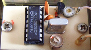 This type of marker generators is nothing special. However, the circuit used here is very simple, differs from the original data sheet and (fig») has few components. All-in experiment showed a good functioning of the circuit and the beeps are also strong enough on the 2 m band. With a 6.4 MHz crystal and the internal oscillator, the generated frequency is divided further and creates marks of 12.5, 25, 50 and 100 kHz. See the table.