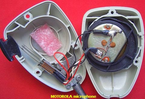 Motorola heeft diverse types microfoons voor mobilofoons in gebruik gehad. Het afgebeelde (fig») model is van zeer goede kwaliteit. In het metalen kapsel zit een dynamisch element en een print met één-transistor versterker. De gelijkstroom weerstand van het element is 187 Ohm