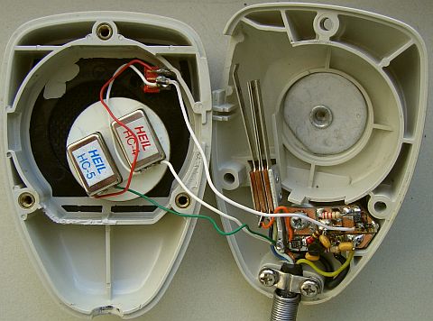 Aanvankelijk kon met een schakelaar gekozen worden uit één van beide elementen. Omdat ik een keer benieuwd was wat er zou gebeuren werden bij wijze van experiment beide kapsels parallel geschakeld. Dat gaf in combinatie met mijn stem de beste weergave en een hogere gemiddelde output van de zender. Bijna hetzelfde effect alsof er met een speechprocessor gewerkt werd. Nu kan met de schakelaar gekozen worden voor alléén HC5 of HC5 mèt HC4. In de praktijk geven de meeste tegenstations aan het laatste systeem de voorkeur. Beide microfoonkapsels zijn samen met versterker en schakelaar («fig) in een Motorola microfoonbehuizing gemonteerd. Mijn Ten Tec Corsair II HF transceiver is vrij gevoelig voor LF instraling op een microfoon en nu is dat probleem er niet meer, zelfs als een HF versterker ingezet wordt achter de transceiver.