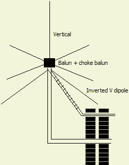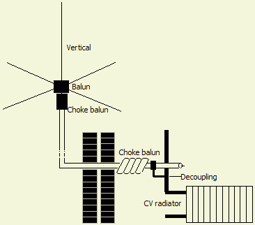 Het aanbergen van een mantelstroomfilter (choke balun) en een kort stuk draad als tegencapaciteit kan veel (instraal)ellende voorkomen. Nog beter is het aanbrengen van een extra choke balun op het punt waar de kabel het huis ingevoerd wordt zoals dat bij de vorige verticale antenne getekend is of dicht bij de uitgang van de zender.