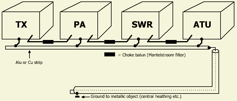 Een storing in onze eigen apparatuur onderdrukt of bestrijdt men door alle apparaten via de vleugelmoer te verbinden met één rail, buis of metalen strip van aluminium of koper dat dan aan een groot metalen object (b.v. CV) ontkoppeld of "geaard" wordt. Wat ook goed werkt als ontkoppeling is een hulpaarde van per band een ¼ golflengte (L) draad aan de apparatuur of rail.