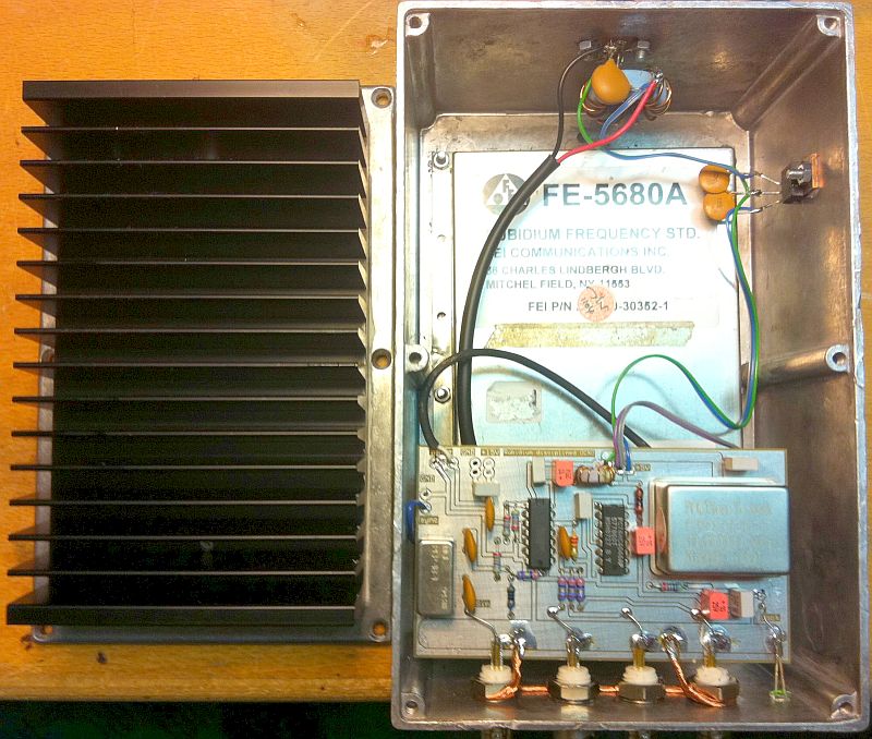 Image below shows the implementation of the above circuit diagram. The heat sink is removed for this picture only. The OCXO is disciplined by the Efratom FE 5680A. Note that most Rubidium standards need approx 2-3 Amps at 15-24 Volts at start-up and the OCXO between 0.3 and 0.6 Amp at 5 Volt. The whole unit is therefore powered by an external low cost laptop-intended switched PSU. The 5 Volt for the logics and OCXO is accomplished by an internal 7805 circuit built into the box as shown below. A solid heat sink is a must to keep the maximum temperature within the Rubidium/OCXO specified range.