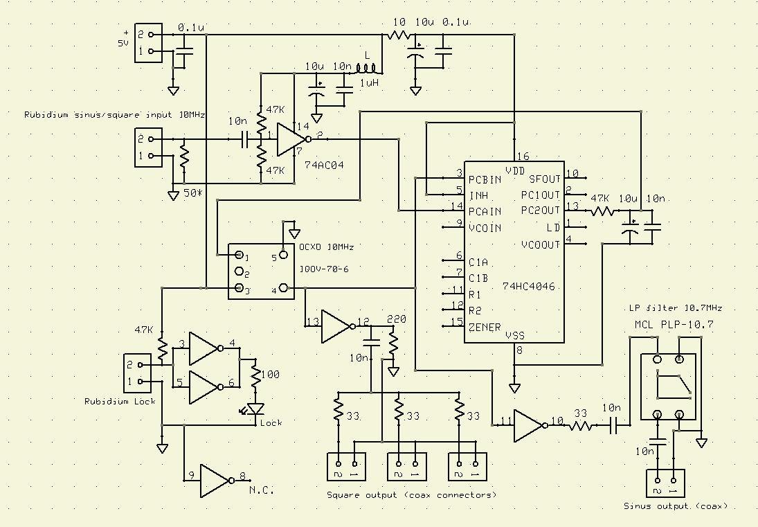 A 74AC04 is used for signal ‘shaping/driving’ and input handling for the PLL 74HC4046. Three (3) outputs with square wave are available for optional use for frequency counters, SDR’s or auxiliary devices that need low noise accurate frequency references.