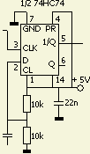 De kristaloscillator was een overtone type met een afgestemde kring in de collector. De instelling en de sturing naar 74HC74 bleken nogal kritisch te zijn. Misschien ook omdat hier al jaren onderdelen gerecykeld worden van afgedankte consumenten elektronica. Toen de andere helft van een 74HC74 gebruikt werd om de overtone oscillator door twee te delen, was het probleem opgelost (door de blokspanning uit de deler). Deze extra deling is in dit ontwerp niet aangebracht omdat het met de volgende oscillator niet nodig was.