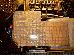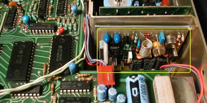 Op de PAØCMU's print kan de blokoscillator (fig») gemonteerd worden in de ruimte (blauw kader) van de oorspronkelijke overtone oscillator. Ernaast is plaats voor een op zijn kop gelijmd relais. Eventueel moet in de VFO de condensator van 10 – 22 pF tijdelijk vervangen worden door een trimmer om het regelbereik in te stellen. Blik de stabilisator in met doorvoer condensatoren om ongewenste stoorstraling in de ontvanger te voorkomen. Op de foto is de tijdelijk geopende stabilisator te zien in mijn Ten Tec Corsair II. |