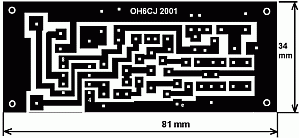 Een echt printontwerp (fig») werd door PAØCMU gemaakt. Met enige handigheid is dat 5.5 × 6.5 cm printje voor het door mij gewijzigde ontwerp te gebruiken. Pin 3 van CA3140 komt op de halve voedingsspanning.