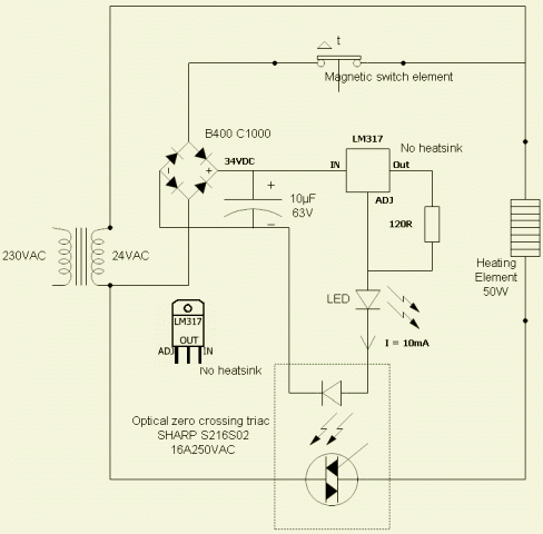 With his modification, a maximum of 11 mA passes through the switching element and the heating element is switched on during the zero crossing of the 24 VAC. It works with a 'power switch zero-cross power-on triac' or 'zero-crossing optotriac' of SHARP type S216S02. The latter has more or less become obsolete, but a replacement can be type CPC1998J of IXYS.
