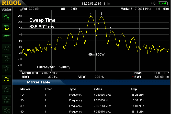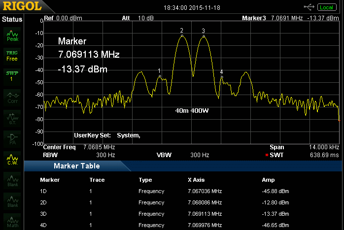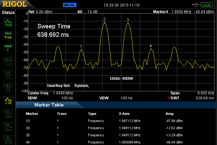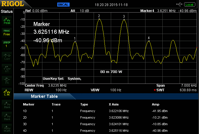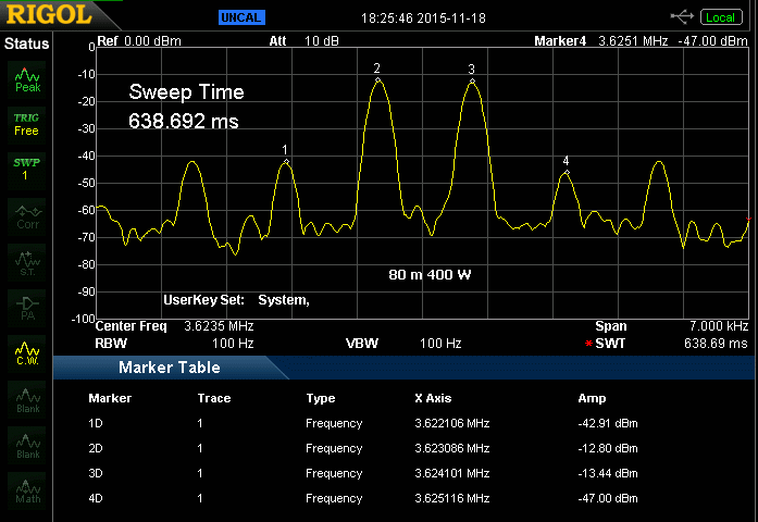 Enige beelden van een spectrumanalysator om een indruk te krijgen van het IMD gedrag van deze versterker. De onderdrukking van de derde orde harmonische is het verschil tussen marker 3D en 4D (of 2D en 1D). Er moet tevens vermeld worden dat de SDR stuurzender vrijwel hetzelfde IMD beeld vertoonde. Een voorzichtige conclusie is dat deze AL-811H het aangeboden signaal niet verslechtert.