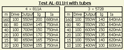 Regelmatig zijn er discussies op forums over de vraag of 811A buizen beter vervangen kunnen worden door meer robuuste 572B's. Mijn voorkeur zou ook uitgaan naar het laatste omdat ik daar meer ervaring mee heb. Daarom werd met beide types een sumiere test gedaan. Het overzicht is enigzins vertekend omdat de SWR en dus de sturing bij de 572B's minder goed was dan met de origenele buizen.