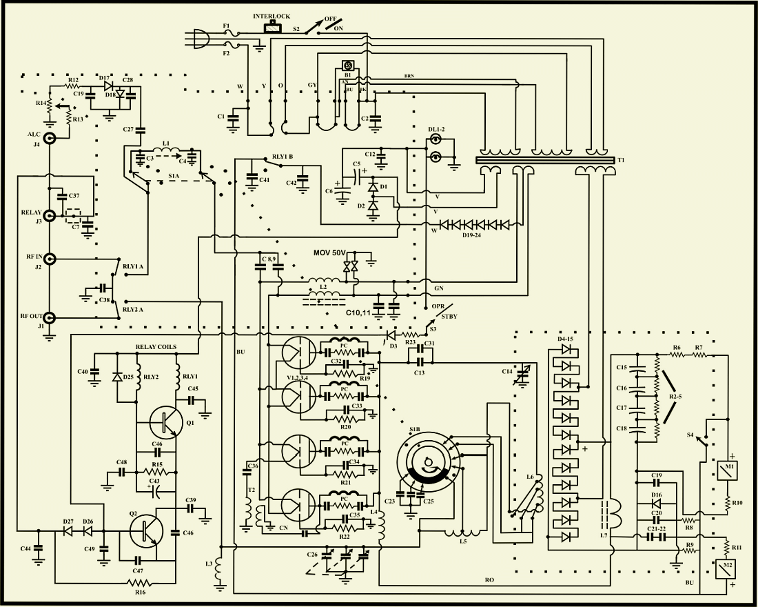 Bij Ameritron zijn ze niet sterk in het tekenen van foutloze («fig) overzichtelijke schema's en zijn daarbij ook niet consequent bij het intekenen van de componenten. Van hetzelfde apparaat circuleren afwijkend getekende schema's. Om het circuit van de meters beter te kunnen volgen heb ik dat anders getekend. Bij een vonkoverslag in de buis kan men zien hoe de 50 Ohm weerstand het loodje legt en een van de varistors gedeeltelijk een geleider werd. D16 dient als bescherming van de meters en gaat ook vaak kapot door een "flash-over".