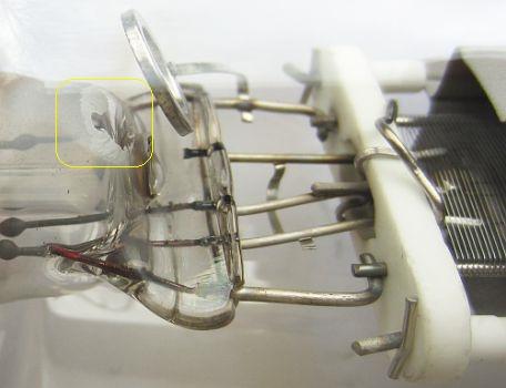 Overigens doorslag kan ook ontstaan door parasitair oscilleren hetgeen zijn oorzaak vindt in een verkeerde opstelling van of een inadequate aarding van componenten. Geziende schade in de afgebeelde buis, denk ik dat het ontstaan is door parasitair oscilleren, waarbij een hoge spanning ontstond. De energie kon niet weg via de hoge impedantie van de anodekring en koos dus de kortste weg via de buis.