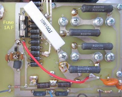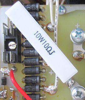 Monteer een 10 Ohm/10 W draadgewonden weerstand en verwijder aan de onderkant van de print ferrietkraal L7 (bij L4). De draadgewonden weerstand werkt ook als vervanger van smoorspoel L7.