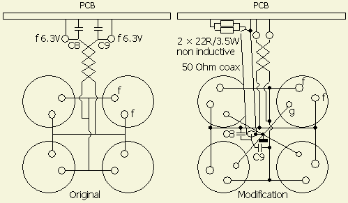 De buisvoeten werden 180° gedraaid, rooster ontkoppel condensators, weerstanden en ferriet kralen werden verwijderd.