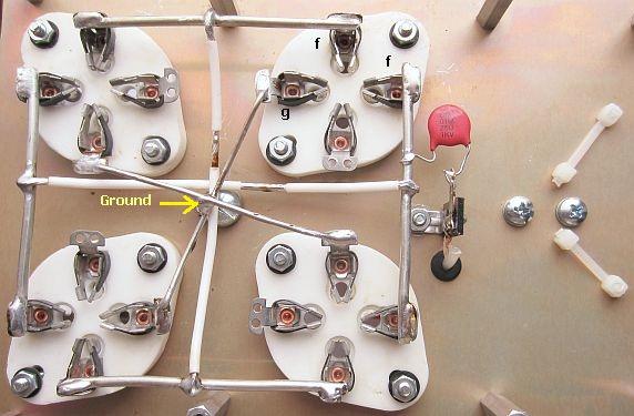 Mijn overtuiging en ervaring is dat wild oscilleren van een versterker met buizen meestal vermindert of voorkomen wordt door het aarden op één centraal punt of door een te lange (om)weg van HF stromen sterk te bekorten. Ontwerpers gaan er teveel van uit dat de stroom zich adequaat verplaatst via geschroefde of gelaste mechanische verbindingen. In werkelijkheid is geenzins te voorspellen hoe de circuits zich daadwerkelijk gedragen. Daarom worden in al mijn eigenbouw of gemodificeerde versterkers, zo mogelijk de roosters direct aan aarde gelegd en als het kan via één aardpunt. Dat is als modificatie ook gedaan in deze versterker en het centrale aardpunt is de schroef aan de onderkant van de anode smoorspoel. De buisvoeten werden 180° gedraaid om de afstand van de roosterlip tot het aardpunt zo kort mogelijk te houden.