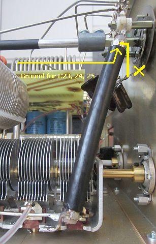 Verder werd de bodemschroef van de plate condensator (C26) met een korte draad verbonden met de schroef van L4, zodat de tuning condensator een kortere weg heeft naar het centrale aardpunt en niet via een langere omweg.
