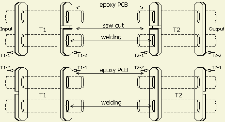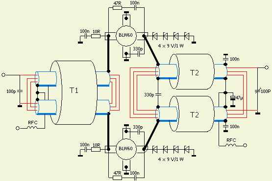 T 1 en T2 zijn HF trafo's die in balans de transistors T3 en T4 in en uitsturen. De overzetverhouding is 1 : 3 en 3 : 1 en dat is een impedantie verhouding van 1 : 9. De windingen zijn ook 1 en 3. T1 is een varkensneus van 15 × 14 × 9 mm en T2 bestaat uit twee ferriet pijpjes of een samenstel van ringkernen zodat en pijpje ontstaat.