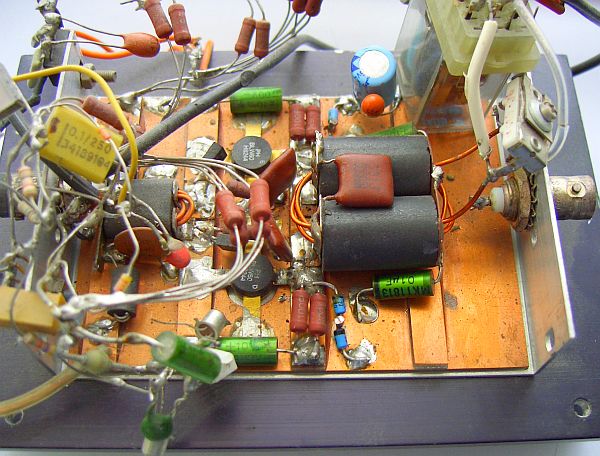 Door mij werden diverse HF en VHF versterkers met transistors letterlijk nagebouwd, maar in de praktijk was een behoorlijke modificatie nodig om een goed werkend apparaat te krijgen. Met de verkregen ervaring en met VHF transistors in balans werd louter door experimenteren en proberen (Foto) een lineaire HF versterker samengesteld en geoptimaliseerd.