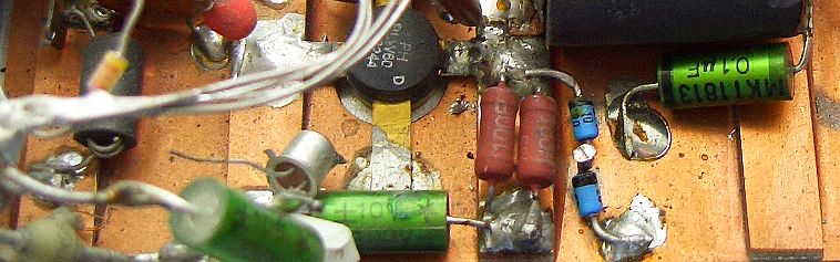Plaatsing en montage van de voornaamste componenten kan het beste gedaan worden dorr middel van directe verbindingen (fig») op de koperzijde van een PCB. De transistors zijn met de emittors op het koper (aarde) gesoldeerd. Verder zijn voor soldeerpunten van onderdelen stroken van 5 mm breed (foto) glasvezelprint gezaagd of geknipt en met twee componentenlijm op het koper geplakt. Een zogenaamde dode kevermethode, maar dan anders zou Cruyf zeggen