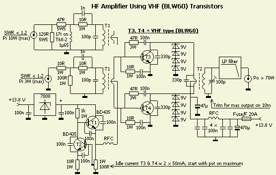 De VHF transistors (T3, T4) worden door een 47 ? weerstand stevig tegen gekoppeld. Dat verlaagt de impedantie aan de basis en vermindert ook hun versterking. Daarom zal een ander type VHF transistor het waarschijnlijk ook goed doen in deze schakeling.