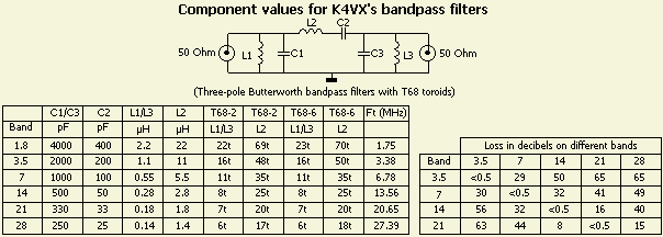 K4VX publiceerde in QST 09-1988 een driepolig Butterworth banddoorlaat filter om de last van krachtige omroep stations in onze ontvanger ingangen te verminderen. De getoonde componenten zijn ook geschikt om harmonischen te onderdrukken van 100 W zenders.