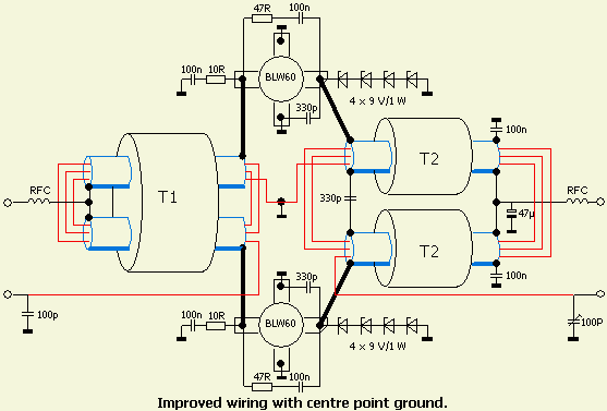 Door het stoeien met eindversterkers van Atlas transceivers bleek dat het aardpunt van de windingen belangrijk te zijn. Afhankelijk van het printontwerp kan het aarden op een centraal punt, ongeveer midden tussen de transistors, voor alle banden een gelijkmatiger ouput te zorgen of zelfs meer vermogen op te leveren.