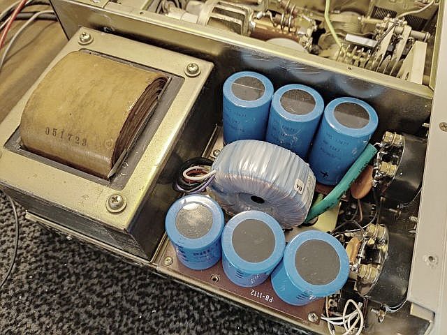 In his opinion was the wire of the 12 V connection of the power transformer too thin to feed the filaments of the GI7Bs. That is why he installed a small toroidal transformer between the capacitors of the HV power supply.