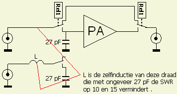 The thin hook-up wire and long connections to the relays in the input circuit creates problems, especially at the higher HF bands. A 27 pF capacitor across the relays contacts (sometimes even across the input connector) creates a broadband tuning of the cabling in the 10 – 15m frequencies. Using a trimmer can improve results even more. Wiring using coax cable can help but often the capacitor is required due to the cabling around the relays.