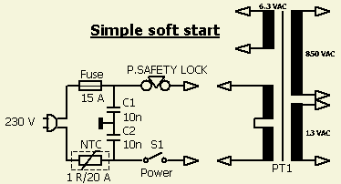 A simple but effective delay can be done with an NTC resistor. The primary winding of the transformer is only a few Ohm, so that a 1Ohm/20A NTC is sufficient to limit the large momentary switching currents of uncharged HV elco's and cold filaments. |