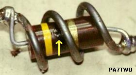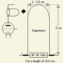 If you happen to have to replace the coil make then a hairpin according to the diagram and picture. A standard "design" was developed after much trial and error and consists of 12 cm wire shaped in a "U" with a distance of 2 cm between the "legs". However use 13.5 cm and use the 1.5 cm to wind around the legs of the resistor and solder it. Use standard tinned wire because this introduces additional losses on VHF ensuring a broadband functioning of the trap.