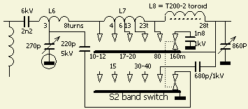 At the highest band, the tuning-C cannot be made small enough because of the high capacity of the anode circuit. It consists of the combined anode capacities of all valves, about 10–15 pF for the tuning capacitor's minimum and about 4–8 pF for stray capacity. At about 5 pF anode to grid capacity for one valve, our total minimum tuning capacity raises the loaded Q at 10 m and perhaps even at 15 m. This results in lower efficiency through higher circulating current losses and a lowered output at the antenna terminal. However, the situation is not that bad. We may consider the anode- and stray capacity as the C of a separate L-network in which the lead from anode clip to tuning-C acts as an inductance. We then see a combined L- and PI-network. Assuming that the anode lead is about 12 cm long (about 0.06 μH –> reactance = 12 Ω at 30 MHz), we may obtain (by the necessary parallel-to-series conversion) an equivalent driving-point impedance which may be about 30 % lower, and an associated shunt reactance which is also much lower. The net result of this analysis can be an explanation for the still reasonable circuit efficiency in the 10 m and 15 m bands. However the plate tank capacitor should be mounted as close to the tube as temperature considerations will permit, to make possible the shortest capacitive patch from plate to grid. Especially at the higher frequencies where minimum circuit capacitance becomes important, the capacitor should be mounted with its stator plates well spaced from the chassis, shielding or other metal parts.