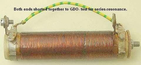 A sturdy ceramic wire-wound resistor, with its resistance wire removed, will make a good former. A diameter of about 2 cm and a length of 10 cm is satisfactory. Closely wind the former with one layer of 25–28 SWG enamelled wires over a length of 5–10 cm. In most cases its inductance is sufficient, even at a lowest frequency of 1.8 MHz. To test for series-resonance, short both ends together («fig) and (with a GDO) checks for resonance's in the amateur bands. If there are none, you are lucky.