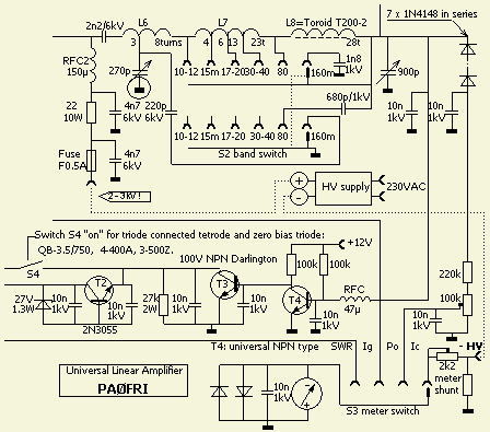 The lower diagram was for the rebuilt amplifier using a single TB3/750 triode. Some features may be of interest and encourage other experimenters tackling a high-power linear: