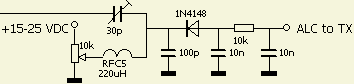 Na allerlei uitprobeersels bleek alweer dat een simpele schakeling (fig») met 10k potmeter, RFC5, 1N4148, 90 pF en 30 pF trimmer het beste werkte. De schakeling wordt nog gevoeliger door een schotky BAT85 diode te monteren. De hogere gelijkspanning van 15 – 25 V komt van het ongestabiliseerde deel van de 12 V voeding. Pas de volgende afregelprocedure toe. Verbindt met een afgeschermd snoer de ALC pluggen van transceiver en versterker met elkaar. De potmeter wordt van het maximum uit iets teruggedraaid. Geef vol vermogen op de 10 m band en meet de output van de lineair. Regel met de (tol)trimmer zodanig af, dat de naald van de wattmeter net terugvalt. Met de potmeter is daarna het vermogen verder te reduceren.