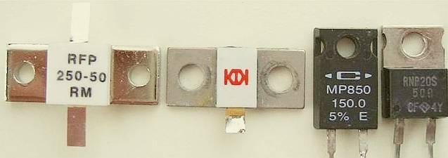 In de Amerikaanse beschrijvingen van HF versterkers vindt men dat een paar watt voor deze tegenkoppel weerstand goed genoeg is. In de praktijk worden ze ook met SSB erg warm, daarom lijkt mij een weerstand van meer vermogen beter. Stel de set levert 100W en de versterker heeft maar 80W nodig. Dan is een weerstand van 20W een veilige keus. Tenslotte is het eigenbouw en dat maken wij zo goed mogelijk. Rechts (fig») ziet u een aantal "chip" modellen van een reflectievrije weerstand.