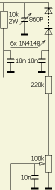 Het systeem met zes of meer 1N4148 diodes in serie voor het meten van de output (Po) gebruik ik al vele jaren in mijn zelfgebouwde dummy-loads. In de tekening («fig) gaat de gelijkgerichte spanning via 220 kΩ naar de 100 kΩ potmeter (fig»). Speciale diodes of compensatie met condensatoren is op HF niet nodig. Het geheel werkt behoorlijk frequentieonafhankelijk en als de 1 mA schaal goed geijkt wordt, is de eigenbouw Wattmeter nauwkeuriger dan vele kastjes van de bekende snoepwinkels. In de lineair dient het systeem als relatieve outputmeter. De aanwijzing op de hogere banden zal wat enthousiaster zijn omdat de impedantie van het meetpunt niet op alle banden 50 Ω is. Door montage en bedrading wordt ongewenst capaciteit en zelfinductie aan de schakeling toegevoegd.