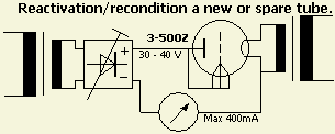 Het reactiveren gaat het gemakkelijkste door verwarming in de versterker. Stel de anodespanning buiten werking en warm de buis gedurende ongeveer een uur op met alleen de gloeispanning aan en ventilator uit. (Opgepast: bij veel keramische buizen moet de ventilator aan blijven). Herstel daarna HV en laat de buis ten minste een uur lang (met ingedrukte PTT schakelaar) niet meer dan de opgegeven russtroom trekken. Belast tijdens dat proces de uitgang met een kunstantenne (dummy load) om eventueel oscilleren te voorkomen. Na deze behandeling kan met ingeschakelde hoogspanning en ventilator voorzichtig sturing gegeven worden.