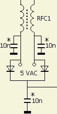 RFC1 is zelf te maken met een ongeveer 1 cm dikke ferriet staaf van minimaal 10 cm lengte uit een AM radio. De smoorspoel ziet u («fig) onder de buisvoet. Zo'n staaf wikkelen met twee geïsoleerde draden parallel (bifilair) van ten minste 1.8 mm doorsnede. De bereikte zelfinductie is zelfs voor de 160 m band voldoende. Met dikker draad kunt u beter een langere staaf nemen of een aantal ferriet staven bundelen. De smoorspoel wordt ook door mij als gelijkstroomweerstand gebruikt om de stroomstoot door het inschakelen te beperken. Daarom is de staaf voorzien met maar 1,8 mm dik draad.