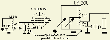 De kring wordt op een band in resonantie gebracht, zodat men de ongeveer 100 pF kan wegdenken. Blijft dus 50 Ohm over om het systeem breedbandig te maken en de buis stabiel blijft door de lage belasting.