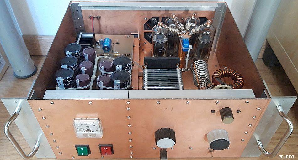 PE1RCO heeft ook en mooi stukje zelfbouw geproduceerd. De kast van printpaat is feitelijk net zo goed geworden alsof het van massief metaal gemaakt is. Gezien het aantal gebruikte schroeven voor de frontplaat, mag men aannemen dat het qua HF afscherming wel in orde is. Voor de zekerheid zijn er toch maar parasietstoppers aan de anode gemonteerd. Vanwege zijn slechte ervaring met 1300 V anodespanning, werd er spanningsverdrievoudiging met gelijkrichting toegepast. Dat kwam uit twee ringkerntrafo's van 230 ÷ 230 VAC onder de print met de afgebeelde elco's. Daarmee was het uitgangsvermogen 500 W op de 80 m band. De versterker is stabiel en bij het afstemmen gebeuren geen gekke dingen. Er is ook nog een aparte trafo voor de gloeispanning en de twee ventilatoren die gevoed worden via een LM317 stabilisator.
