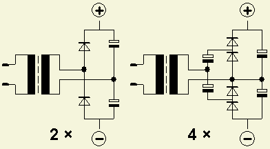 With a doubling or quadrupling circuit (fig»), adequate high voltage can be delivered. Series-connected modern electrolytic with large capacity and high voltage (e.g. 470 μF/400 V) will give adequate smoothing and regulation during modulation peaks. They should be individually bridged by an equalising resistance of 100 kΩ (2 W). For safety reasons and adequate cooling, it is better to have two 220 kΩ or three 330 kΩ resistors in parallel instead of one of 100 kΩ.