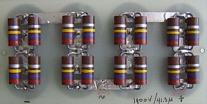 Weerstanden monteer ik altijd in kanteelvorm aan de koperzijde van een epoxyprint en de elco's komen aan de andere kant. In dit voorbeeld werden vier rijen van twee elco's in serie gezet. Er werden in plaats van drie, twee weerstanden parallel over de elco's geplaatst omdat het 2 W types waren en de onbelaste spanning maar 1900 V was.